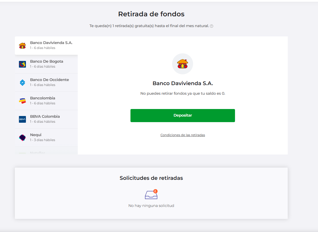 De acuerdo con las reglas contra el lavado de dinero, debes usar el mismo método de pago para retirar dinero que usaste para depositarlo. El retiro mínimo es de USD $2. El tiempo de procesamiento del retiro depende del método utilizado. Los monederos electrónicos suelen recibir el dinero en 24 horas. Las tarjetas pueden tardar hasta 3 días hábiles. Las transferencias bancarias pueden tardar hasta 5 días hábiles. Puedes hacer un retiro gratis al mes. Cualquier retiro adicional dentro del mismo mes tiene un cargo del 2% (máximo USD $30).