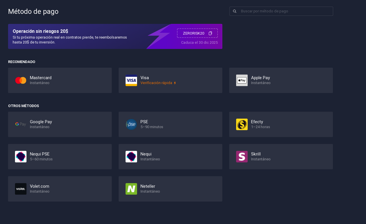 Puedes hacer depósitos con tarjetas de crédito y débito principales, incluyendo Visa, MasterCard y Maestro. Los depósitos con estas tarjetas suelen procesarse de inmediato. Las transferencias con monederos como Skrill, Neteller y WebMoney también son populares, ya que son una forma segura y rápida de mover fondos para usuarios de pagos digitales. Para quienes deseen depositar montos mayores, también se admiten transferencias bancarias, aunque pueden tardar más en procesarse. El depósito mínimo es de solo USD $10. IQ Option no cobra comisión por depositar, pero tu proveedor de pagos podría hacerlo, así que conviene revisar eso con anticipación.