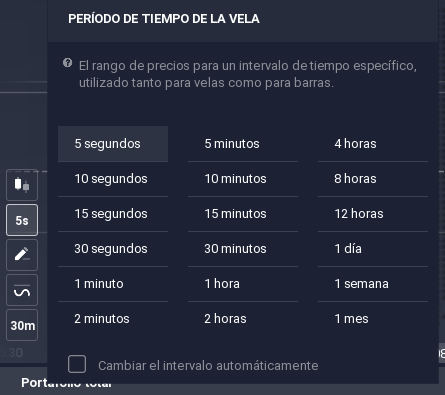 La plataforma ofrece precios de mercado en vivo continuos para cada activo, lo que permite hacer trading con datos de mercado actualizados. Los gráficos avanzados te permiten cambiar entre diferentes diseños y personalizarlos según tus preferencias. Puede seleccionar marcos temporales que van desde 5 segundos para el scalping hasta 1 mes para el trading de posiciones.