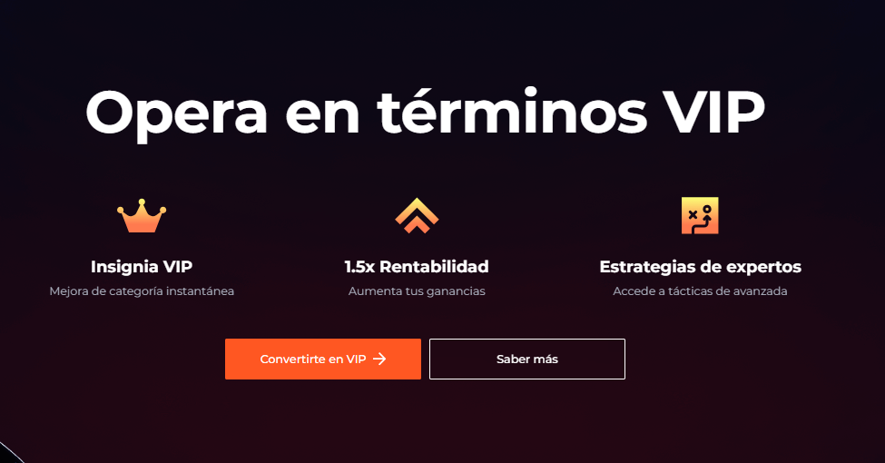 Disponible para traders de alto volumen (los criterios pueden variar por región), la cuenta VIP incluye beneficios exclusivos como un administrador de cuenta personal, retiros más rápidos y mayores retornos potenciales en ciertas operaciones.
